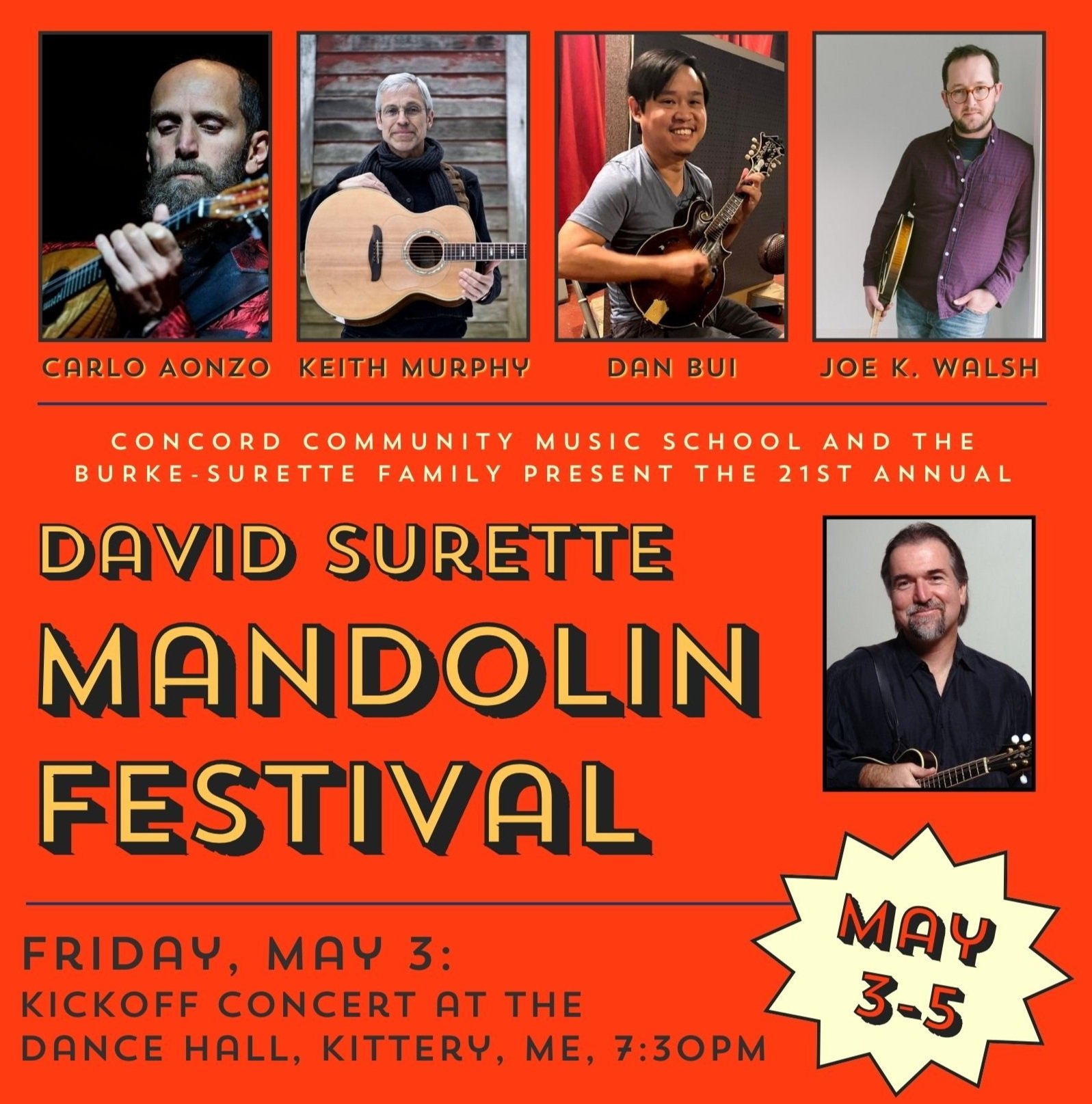 Join us for the David Surette Mandolin Festival kick-off concert! Featuring performances by Dan Bui, Joe K. Walsh, Keith Murphy, Neil Pearlman and special guests Susie and Julianna Burke. Don't miss this stellar lineup of musicians who, between them, cover many musical styles. All well versed in tradition, these talented players also bring tradition into new places.